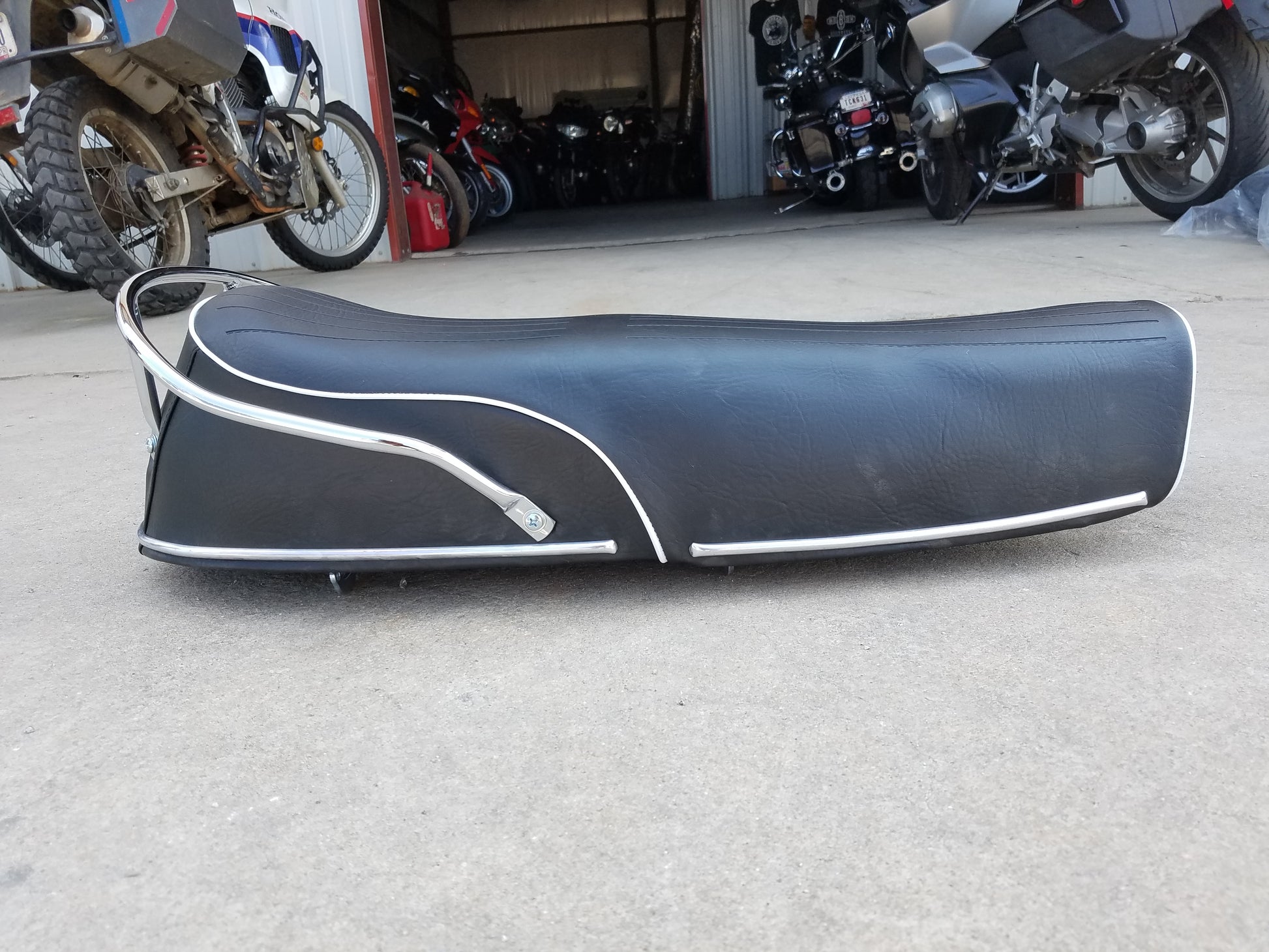 New dual seat for R50/5-R75/5 short wheel base (SWB) models manufactured up to September 1971. Sourced directly from Germany, this saddle features a single rail, vertical stitch striping, attractive chrome trim along the bottom with white cord trim on the front and back, as well as a locking seat post.